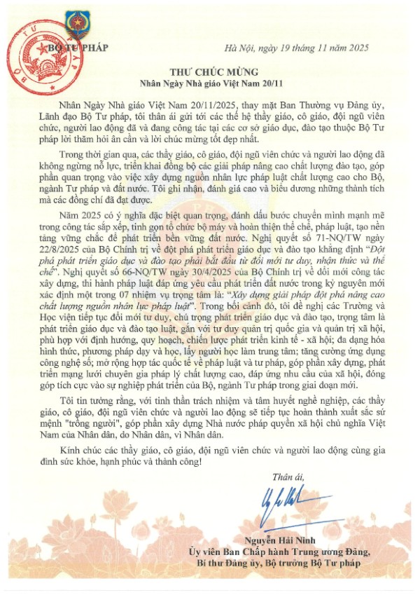Thư chúc mừng của Bộ trưởng Bộ Tư pháp nhân Ngày Nhà giáo Việt Nam 20/11Ủy viên Ban Chấp hành Trung ương Đảng, Bí thư Đảng ủy, Bộ trưởng Bộ Tư pháp Nguyễn Hải Ninh vừa có Thư chúc mừng nhân Ngày Nhà giáo Việt Nam 20/11. Trân trọng giới thiệu Thư của Bộ trưởng.