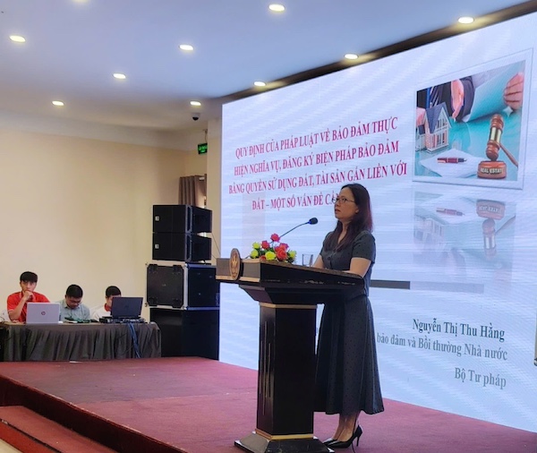 Tại Hội nghị, bà Nguyễn Thị Thu Hằng đã giới thiệu chuyên đề: Quy định pháp luật về bảo đảm thực hiện nghĩa vụ, đăng ký biện pháp bảo đảm bằng quyền sử dụng đất, tài sản gắn liền với đất; đồng thời lưu ý một số vấn đề pháp lý thường gặp trong thực tiễn đăng ký biện pháp bảo đảm.