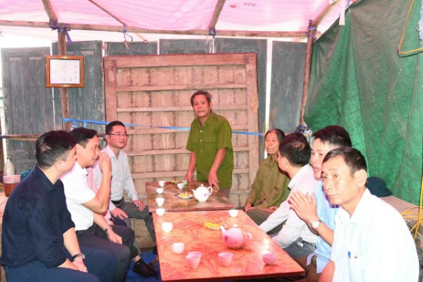 Tiến sĩ Vũ Hoài Nam, Tổng Biên tập Báo Pháp luật Việt Nam (người đội mũ) tới thăm gia đình ông Hà Văn Giáp tại khu Đỗ Sơn 2, xã Liên Minh, tỉnh Phú Thọ.