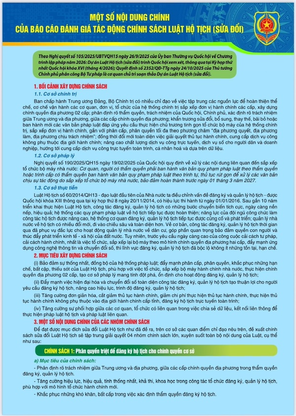 Dự án Luật Hộ tịch (sửa đổi) sẽ thay đổi toàn diện các quy định về thẩm quyền và trình tự thủ tục đăng ký và quản lý hộ tịch, tập trung vào 04 nhóm chính sách lớn, gồm: