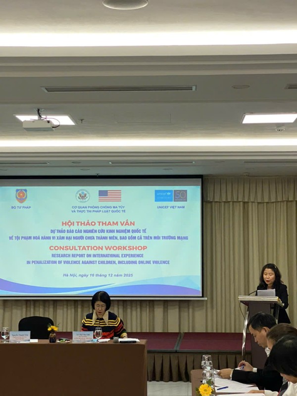 Ngày 16/12/2025, trong khuôn khổ Dự án “Tăng cường tư pháp với người chưa thành niên tại Việt Nam giai đoạn 2022-2026” ký kết giữa Bộ Tư pháp và UNICEF, được tài trợ bởi Cơ quan Phòng chống ma túy và thực thi pháp luật quốc tế (INL) - Bộ Ngoại giao Hoa Kỳ, Vụ Pháp luật hình sự - hành chính (Bộ Tư pháp) đã phối hợp với Quỹ Nhi đồng Liên hợp quốc (UNICEF) tổ chức Hội thảo tham vấn dự thảo Báo cáo nghiên cứu “Tội phạm hóa tất cả các hình thức xâm hại tình dục đối với người chưa thành niên: Ví dụ từ các Quốc gia khác” tại Hà Nội.