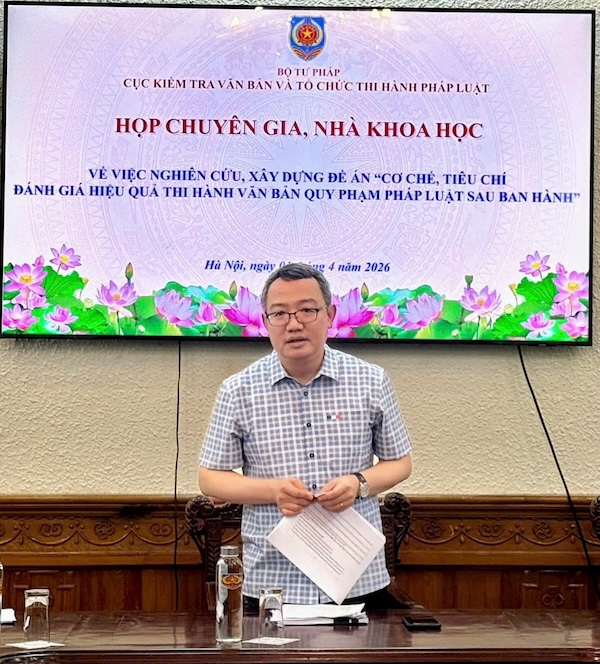 Sáng 01/4/2026, tại trụ sở Bộ Tư pháp, Cục Kiểm tra văn bản và Tổ chức thi hành pháp luật đã tổ chức cuộc họp với các chuyên gia, nhà khoa học trong lĩnh vực pháp luật, thống kê, công nghệ thông tin và kinh tế để xin ý kiến về việc nghiên cứu, xây dựng hệ thống cơ chế, tiêu chí đánh giá hiệu quả thi hành văn bản quy phạm pháp luật sau ban hành.