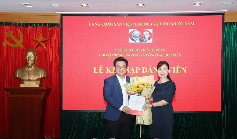 Chiều 23/4/2025, được sự đồng ý của Đảng ủy Học viện Tư pháp, Chi bộ Phòng Đào tạo và Công tác học viên tổ chức Lễ kết nạp đảng viên mới đối với quần chúng ưu tú Đỗ Đức Duy. Đồng chí Phó Bí thư Đảng ủy Nguyễn Minh Hằng dự Lễ kết nạp.