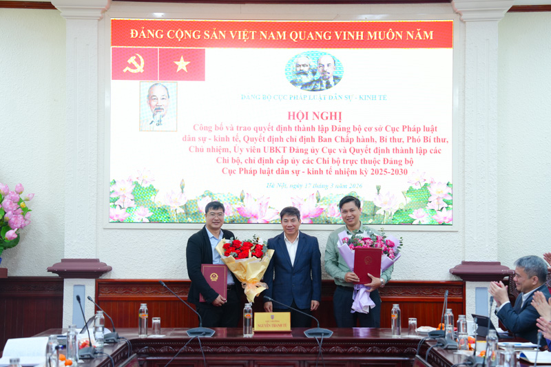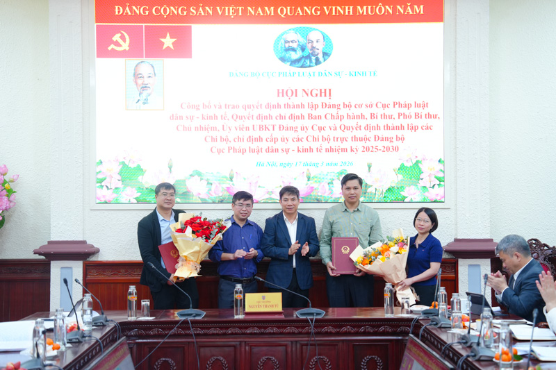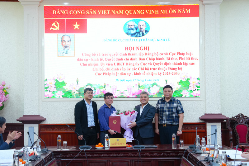 Ngày 17/3, Đảng bộ Cục Pháp luật dân sự - kinh tế đã tổ chức Hội nghị công bố và trao Quyết định thành lập Đảng bộ cơ sở Cục Pháp luật dân sự - kinh tế, Quyết định chỉ định Ban Chấp hành, Bí thư, Phó Bí thư, Chủ nhiệm, Ủy viên Ủy ban Kiểm tra Đảng ủy Cục và Quyết định thành lập các Chi bộ, chỉ định cấp ủy các Chi bộ trực thuộc Đảng bộ Cục Pháp luật dân sự - kinh tế nhiệm kỳ 2025 - 2030. Ủy viên Ban Thường vụ Đảng ủy, Thứ trưởng Bộ Tư pháp Nguyễn Thanh Tú chủ trì Hội nghị.