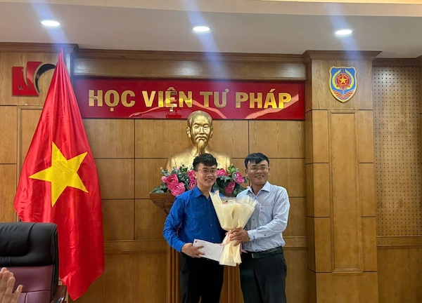 Đồng chí Nguyễn Xuân Thu. Bí thư Đảng ủy, Giám đốc Học viện Tư pháp và đồng chí Nguyễn Văn Bốn, Phó Giám đốc Học viện trao phần thưởng cho hai đoàn viên đạt giải trong Cuộc thi “Tìm hiểu truyền thống Đoàn TNCS Hồ Chí Minh”.