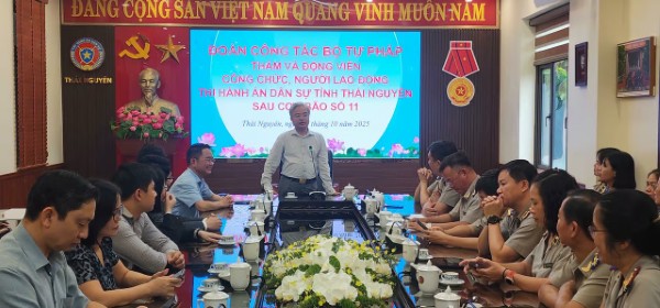 Ngày 14/10, Đoàn công tác Bộ Tư pháp do ông Nguyễn Quang Thái, Phó Bí thư chuyên trách Đảng ủy Bộ Tư pháp làm Trưởng đoàn, đã đến thăm hỏi, động viên và trao quà hỗ trợ cán bộ, công chức, người lao động của Cục Thi hành án dân sự (THADS) tỉnh Thái Nguyên, Sở Tư pháp tỉnh Thái Nguyên và Trường Cao đẳng Luật miền Bắc bị thiệt hại nặng nề do hoàn lưu bão số 11.