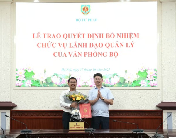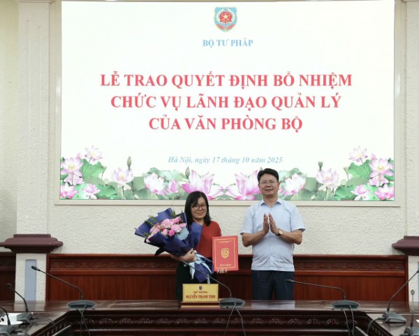Thứ trưởng Nguyễn Thanh Tịnh trao quyết định bổ nhiệm đồng chí Đỗ Thị Kiều Ngân, Phó Trưởng phòng Phòng Tổng hợp giữ chức vụ Trưởng phòng Phòng Tổng hợp, Văn phòng Bộ Tư pháp.