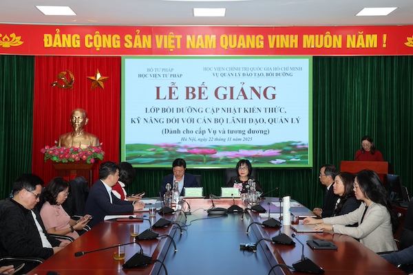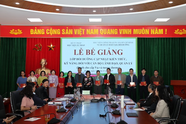 Ngày 22/11/2025, Học viện Tư pháp phối hợp với Học viện Chính trị Quốc gia Hồ Chí Minh tổ chức bế giảng Lớp bồi dưỡng cập nhật kiến thức, kỹ năng đối với cán bộ lãnh đạo, quản lý theo Quy định 145 (dành cho cấp Vụ và tương đương).