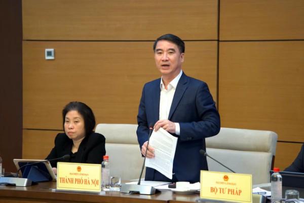 Thứ trưởng Bộ Tư pháp Nguyễn Thanh Tú trình bày tóm tắt Tờ trình tại phiên họp.