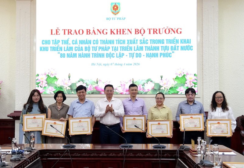 Nhân dịp này, Thứ trưởng Nguyễn Thanh Ngọc đã trao Bằng khen của Bộ trưởng Bộ Tư pháp cho các tập thể, cá nhân, trong đó có tập thể Báo Pháp luật Việt nam đã có thành tích xuất sắc đóng góp trong triển khai Khu triển lãm của Bộ Tư pháp tại Triển lãm thành tựu đất nước “80 năm hành trình Độc lập - Tự do - Hạnh phúc”.