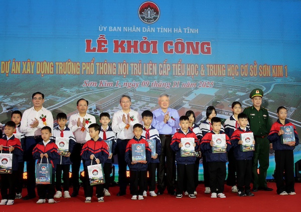 Tại điểm cầu Hà Tĩnh, Phó Thủ tướng Thường trực Nguyễn Hòa Bình dự Lễ khởi công dự án Trường nội trú liên cấp Tiểu học - THCS Sơn Kim 1.