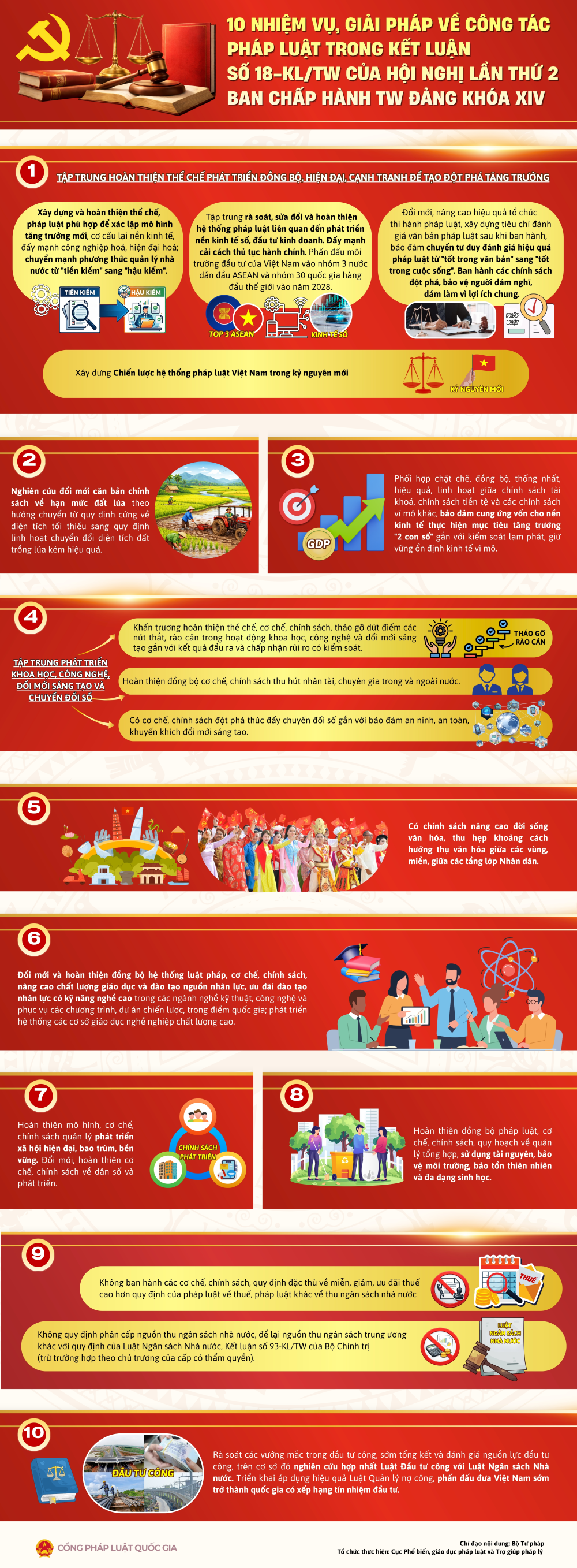 Kết luận số 18-KL/TW của Hội nghị lần thứ 2 Ban Chấp hành Trung ương Đảng khóa XIV đã đề ra 10 nhóm nhiệm vụ, giải pháp trọng tâm nhằm tiếp tục đổi mới, hoàn thiện công tác xây dựng và tổ chức thi hành pháp luật, đáp ứng yêu cầu phát triển đất nước trong giai đoạn mới.