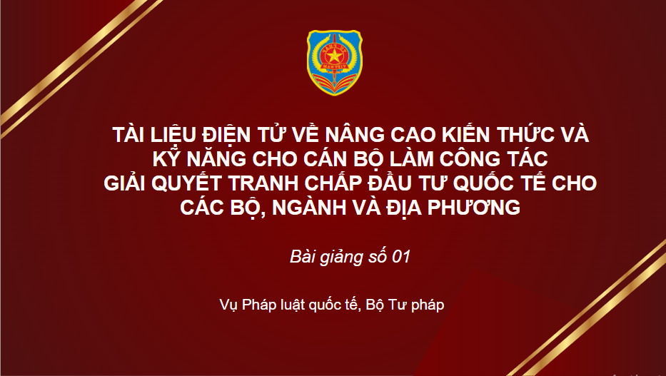 Bộ Tư pháp (Vụ Pháp luật quốc tế) xin giới thiệu tài liệu điện tử về nâng cao kiến thức và kỹ năng cho cán bộ làm công tác giải quyết tranh chấp đầu tư quốc tế cho các Bộ, ngành và địa phương.