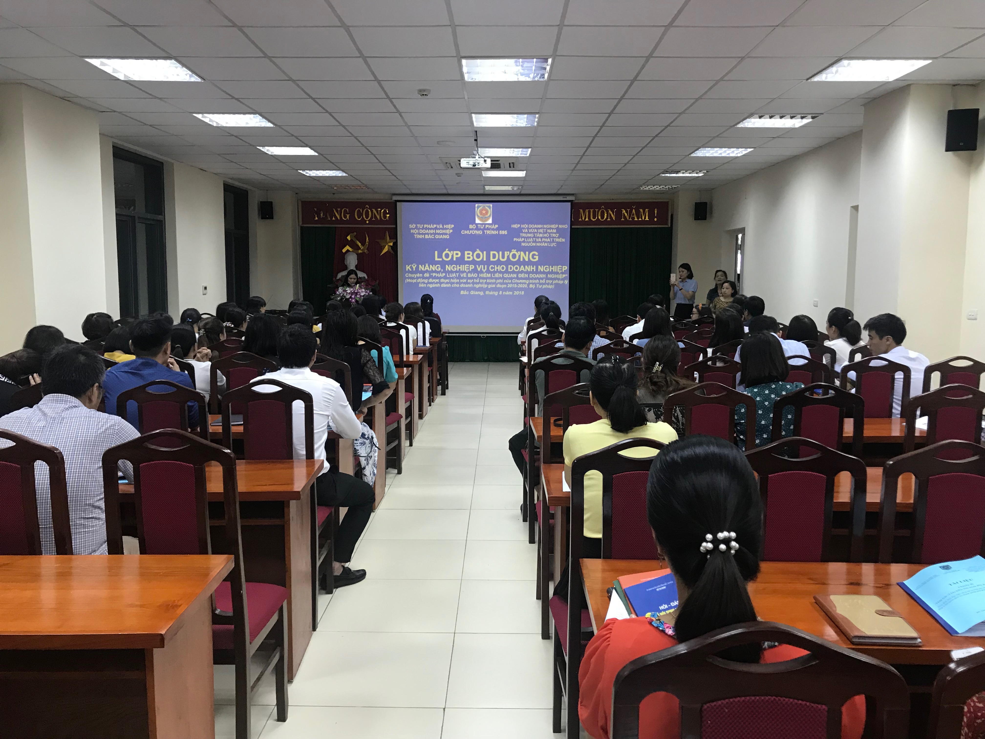 Ngày 02/8/2019 vừa qua, Trung tâm Hỗ trợ pháp luật và phát triển nguồn nhân lực thuộc Hiệp hội doanh nghiệp nhỏ và vừa Việt Nam đã phối hợp với Vụ Các vấn đề chung về xây dựng pháp luật, Bộ Tư pháp, Sở Tư pháp, Hiệp hội doanh nghiệp tỉnh Bắc Giang tổ chức lớp bồi dưỡng kiến thức pháp luật mới về công tác pháp chế doanh nghiệp và pháp luật về bảo hiểm liên quan đến doanh nghiệp. Lớp bồi dưỡng được sự hỗ trợ kinh phí của Chương trình 585.