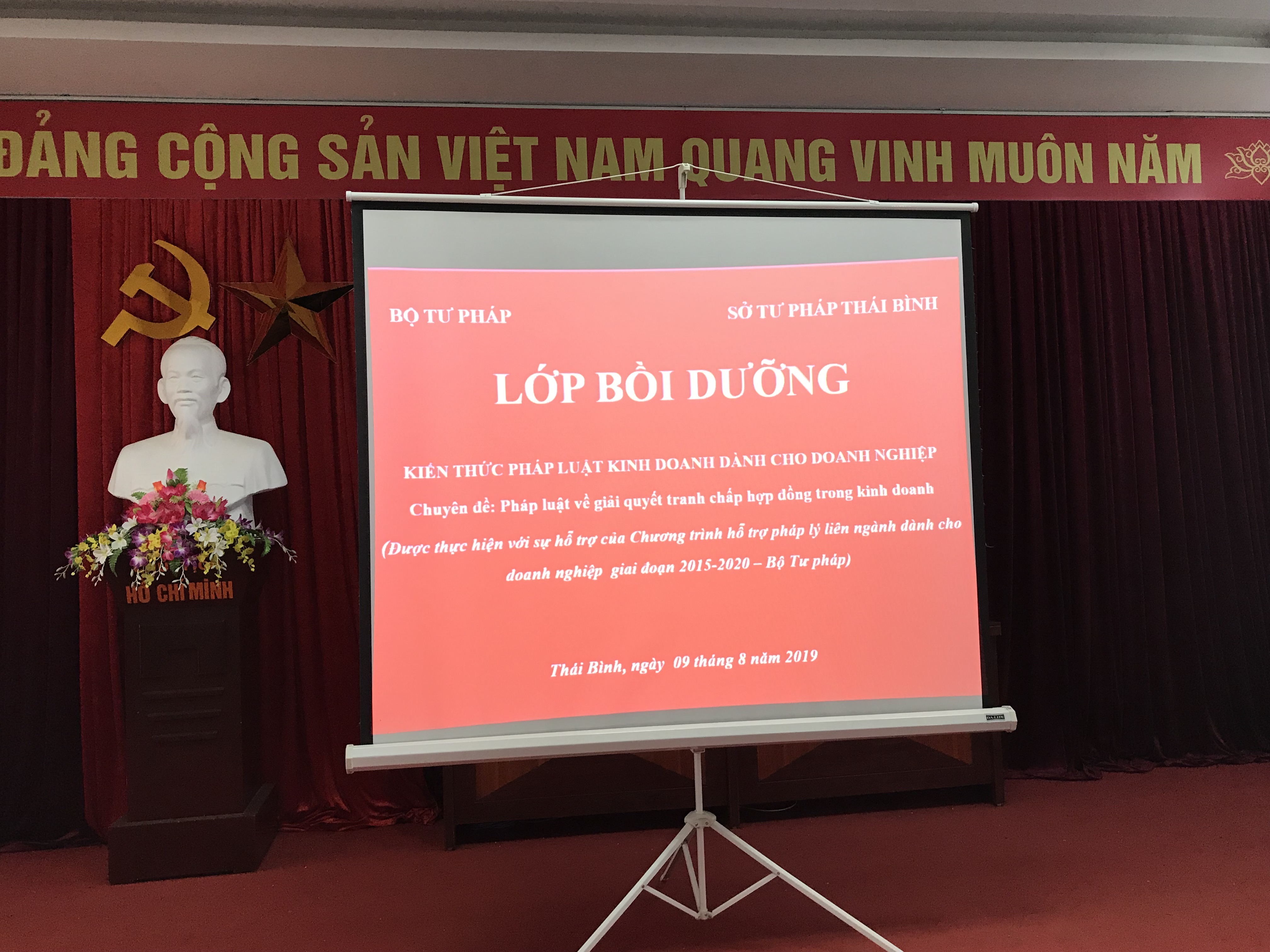 Thực hiện nhiệm vụ theo Hợp đồng số 12/BTP-585 ngày 31/5/2019 giữa Sở Tư pháp và Ban quản lý chương trình hỗ trợ pháp lý cho doanh nghiệp giai đoạn 2015-2020, Sở Tư pháp tổ chức lớp bồi dưỡng kiến thức pháp luật kinh doanh cho các doanh nghiệp trên địa bàn tỉnh Thái Bình với chuyên đề: "Bồi dưỡng kiến thức Pháp luật về giải quyết tranh chấp hợp đồng trong kinh doanh"