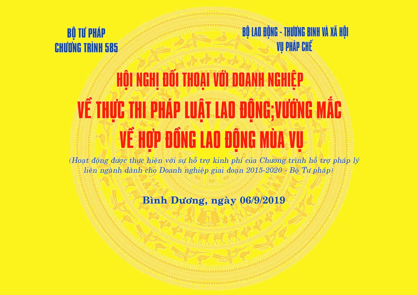 Thực hiện Quyết định số 1309/QĐ-585 ngày 10 tháng 6 năm 2019 của Ban Quản lý Chương trình hỗ trợ pháp lý liên ngành dành cho doanh nghiệp giai đoạn 2015-2020, Văn phòng Bộ Lao động, Thương binh và Xã hội (phối hợp với Vụ Pháp chế) tổ chức hội nghị đối thoại chuyên đề “Đối thoại về những khó khăn, vướng mắc của doanh nghiệp trong quá trình thực thi pháp luật lao động và các vấn đề pháp lý liên quan đến giao kết hợp đồng lao động theo mùa vụ” tại Khách sạn Goldstar, số 37 Hùng Vương. Phường Phú Cường, TP Thủ Dầu Một, tỉnh Bình Dương vào ngày 06 tháng 9 năm 2019.