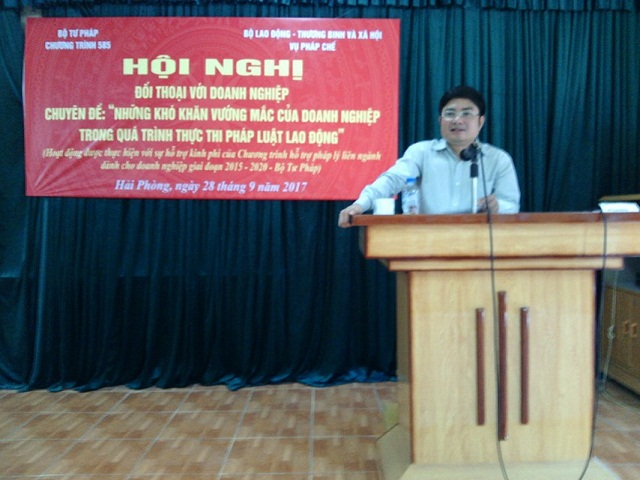 Ngày 28/9/2017 tại thành phố Hải Phòng, Vụ Pháp chế, Bộ Lao động – Thương binh và xã hội đã tổ chức Hội nghị đối thoại về những khó khăn vướng mắc của doanh nghiệp trong quá trình thực thi pháp luật lao động với sự hỗ trợ của của Chương trình hỗ trợ pháp lý liên ngành dành cho doanh nghiệp giai đoạn 2015-2020. Tới tham dự Hội nghị là đại biểu của các Sở, ban, ngành, đại diện các doanh nghiệp, tổng công ty, khu chế xuất trên địa bàn thành phố Hải Phòng.