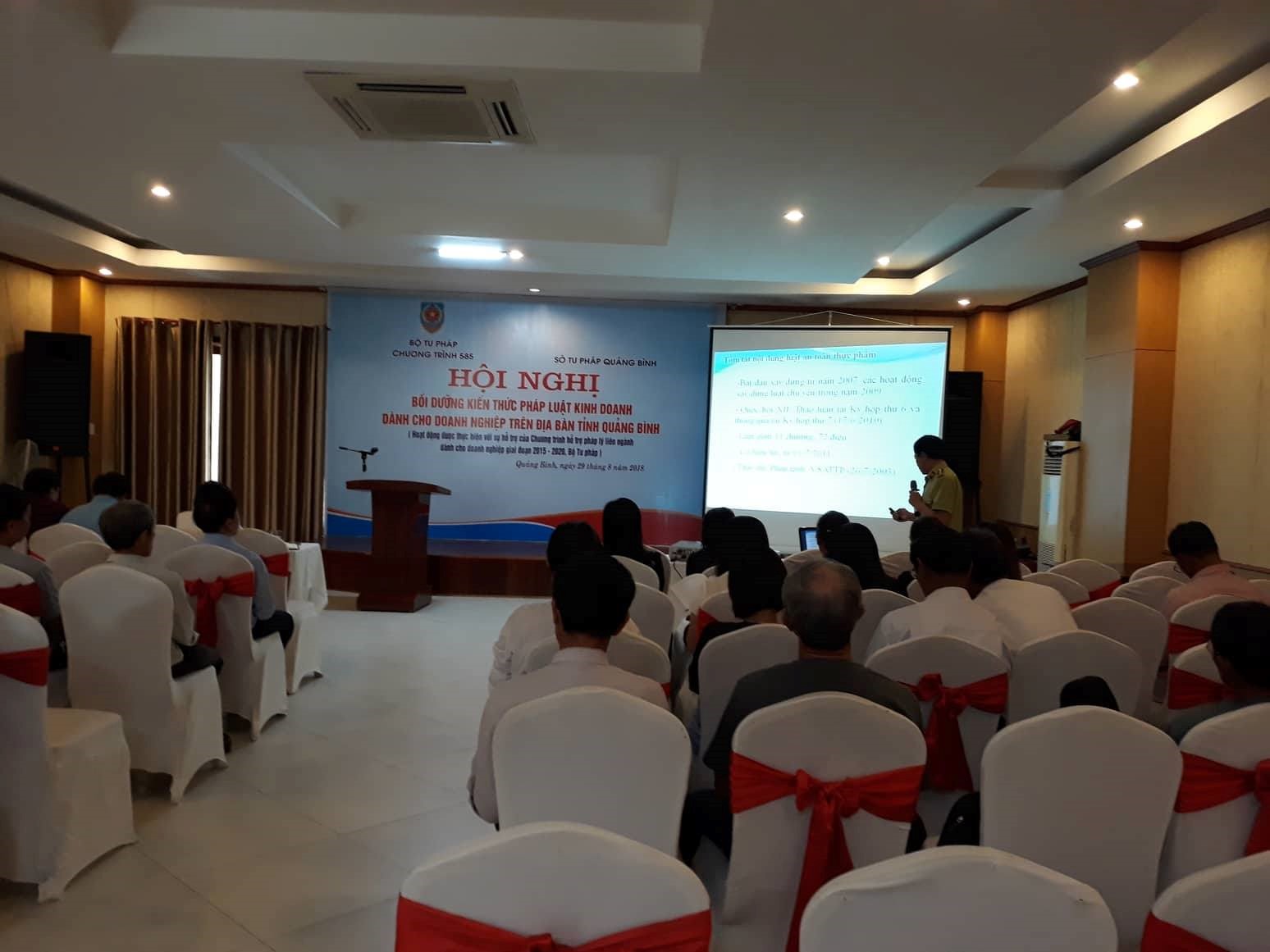 Thực hiện Hợp đồng số 54/BTP-585 ngày 06/6/2018 giữa Ban Quản lý Chương trình hỗ trợ pháp lý cho doanh nghiệp giai đoạn 2015-2020 và Sở Tư pháp Quảng Bình về việc tổ chức hoạt động bồi dưỡng kiến thức pháp luật kinh doanh dành cho doanh nghiệp, ngày 29/8/2018, Sở Tư pháp tỉnh Quảng Bình đã tổ chức Lớp bồi dưỡng kiến thức pháp luật kinh doanh dành cho doanh nghiệp trên địa bàn tỉnh Quảng Bình.