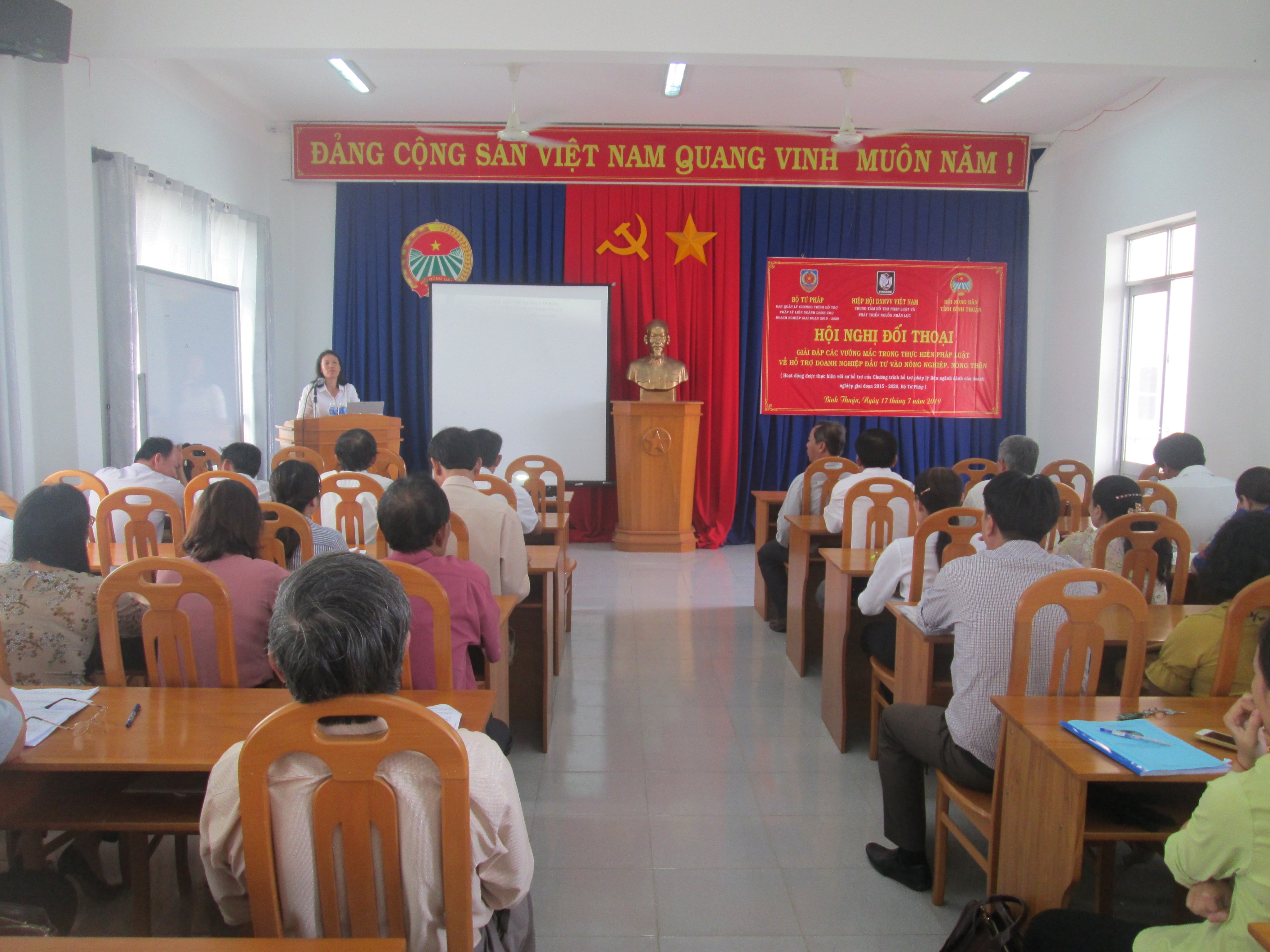 Thực hiện kế hoạch hỗ trợ pháp lý cho doanh nghiệp năm 2019, nhằm hỗ trợ doanh nghiệp tháo gỡ các khó khăn về thủ tục hành chính, tiếp cận đất đai, tài chính và các thông tin, chính sách hỗ trợ khi đầu tư vào nông nghiệp nông thôn; trong khuôn khổ triển khai nhiệm vụ hỗ trợ pháp lý doanh nghiệp thuộc Chương trình hỗ trợ pháp lý cho doanh nghiệp giai đoạn 2015-2020 ( gọi tắt là Chương trình 585) được sự đồng ý của Ban quản lý Chương trình. Ngày 17/7/2019 Trung tâm hỗ trợ pháp luật và phát triển nguồn nhân lực , Hiệp hội doanh nghiệp nhỏ và vừa Việt Nam đã phối hợp với Hội Nông dân tỉnh Bình Thuận và các Sở ngành có liên quan tổ chức “ Hội nghị đối thoại giải đáp những vướng mắc trong thực hiện pháp luật về hỗ trợ doanh nghiệp đầu tư vào nông nghiệp, nông thôn”