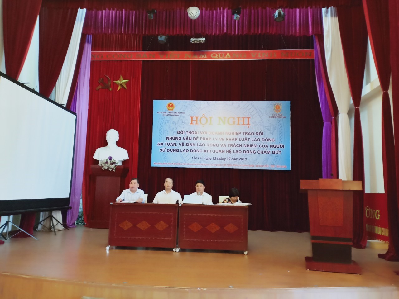 Thực hiện hợp đồng số 67/BTP – 585 của Ban Quản lý chương trình hỗ trợ pháp lý liên ngành dành cho Doanh nghiệp giai đoạn 2015 - 2020 ngày 02 tháng 7 năm 2019 và Cục An toàn lao động. Cục ATLĐ đã tổ chức hội nghị đối thoại với doanh nghiệp về các vấn đề pháp lý liên quan đến hoạt động sản xuất, kinh doanh của doanh nghiệp; Tổ chức các buổi giới thiệu các chuyên đề, các hoạt động hỗ trợ doanh nghiệp nghiên cứu, nắm bắt các cam kết quốc tế với nội dung: “Hội nghị đối thoại về cac vướng mắc, bất cập liên quan những vấn đề pháp lý về pháp luật lao động, trách nhiệm của người sử dụng lao động khi quan hệ lao động chấm dứt”. Hội nghị được tổ chức vào ngày 12/9/2019 tại Khách sạn Lào Cai galaxy, 268 đường Minh Khai Thành Phố Lào Cai tỉnh Lào Cai.