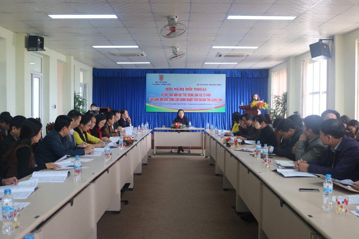 Thực hiện Hợp đồng số 111/BTP-585 ngày 03/12/2018 giữa Ban Quản lý Chương trình hỗ trợ pháp lý cho doanh nghiệp giai đoạn 2015-2020 và Sở Tư pháp Quảng Bình về việc tổ chức hoạt động hội nghị đối thoại với doanh nghiệp về các vấn đề pháp lý liên quan đến hoạt động sản xuất, kinh doanh của doanh nghiệp; tổ chức các buổi giới thiệu chuyên đề, các hoạt động hỗ trợ doanh nghiệp nghiên cứu, nắm bắt các cam kết quốc tế năm 2018, ngày 14/12/2018, Sở Tư pháp tỉnh Quảng Bình đã tổ chức Hội nghị đối thoại “về việc thực hiện các TTHC trong lĩnh vực tư pháp liên quan đến hoạt động của doanh nghiệp trên địa bàn tỉnh Quảng Bình”.