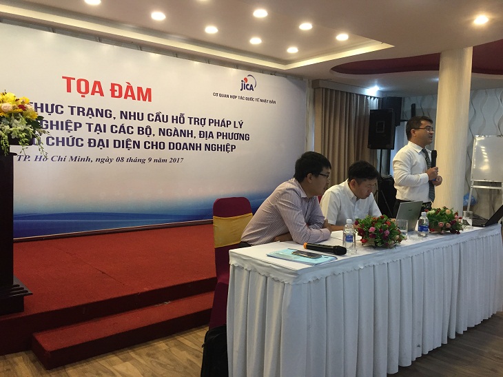 Thực hiện hiện Kế hoạch do Bộ trưởng Bộ Tư pháp và Ban Quản lý Chương trình hỗ trợ pháp lý liên ngành dành cho doanh nghiệp giai đoạn 2015-2020 (gọi là Chương trình 585) phê duyệt, ngày 8/9/2017 tại TP. Hồ Chí Minh, được sự phân công của Lãnh đạo Bộ Tư pháp, Vụ Pháp luật dân sự - kinh tế phối hợp với Cơ quan hợp tác quốc tế Nhật Bản (Dự án JICA) tại Việt Nam tổ chức Tọa đàm “Đánh giá thực trạng, nhu cầu hỗ trợ pháp lý cho doanh nghiệp tại các Bộ, ngành, địa phương và các tổ chức đại diện cho doanh nghiệp”