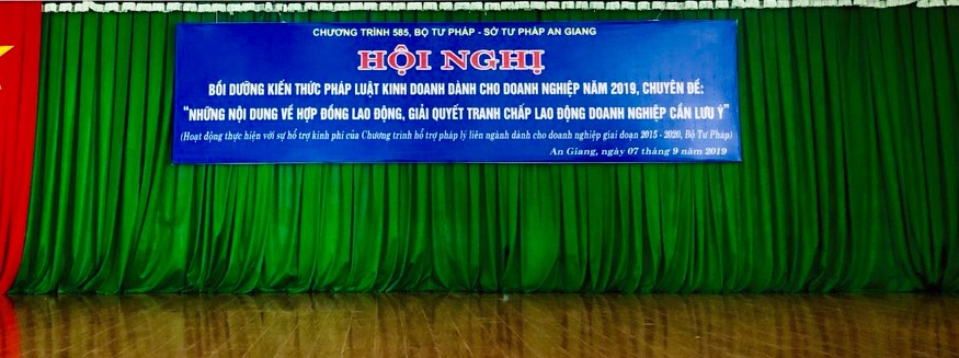 Thực hiện Quyết định số 1427/QĐ-585 ngày 25 tháng 6 năm 2019 của Ban Quản lý Chương trình hỗ trợ pháp lý liên ngành dành cho doanh nghiệp giai đoạn 2015 - 2020, Bộ Tư pháp về việc chọn Sở Tư pháp tỉnh An Giang tham gia thực hiện hoạt động bồi dưỡng kiến thức pháp luật kinh doanh dành cho doanh nghiệp năm 2019 và Hợp đồng số 52/BTP-585 ngày 25 tháng 6 năm 2019 ký giữa Ban Quản lý Chương trình hỗ trợ pháp lý liên ngành dành cho doanh nghiệp giai đoạn 2015 - 2020 và Sở Tư pháp tỉnh An Giang về tổ chức hoạt động bồi dưỡng kiến thức pháp luật kinh doanh dành cho doanh nghiệp năm 2019 với chuyên đề: “Những nội dung về hợp đồng lao động, giải quyết tranh chấp lao động doanh nghiệp cần lưu ý”