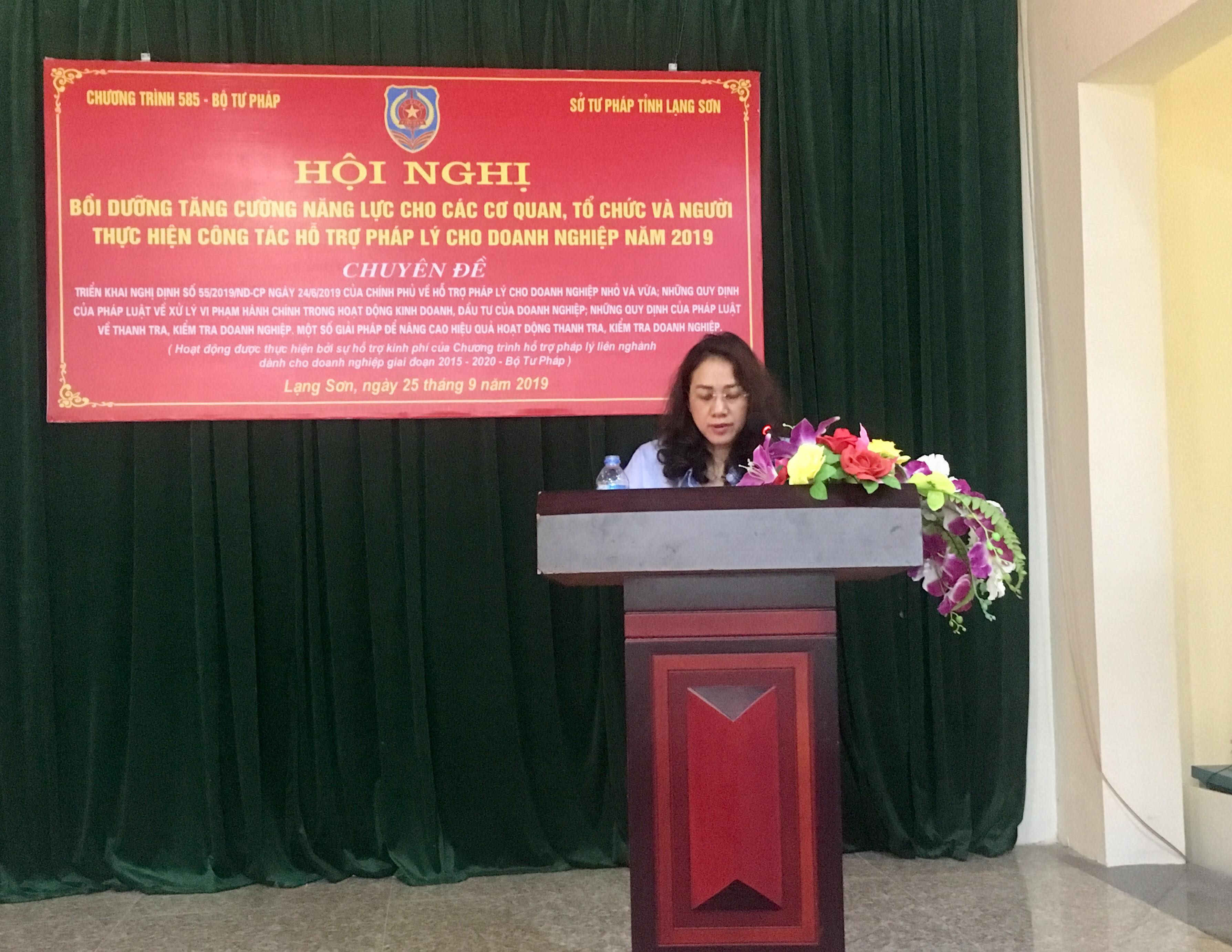 Thực hiện Quyết định số 1486/QĐ-585 ngày 01/7/2019 của Ban quản lý chương trình hỗ trợ pháp lý liên ngành dành cho doanh nghiệp giai đoạn 2015-2020 Bộ Tư pháp về việc chọn Sở Tư pháp tỉnh Lạng Sơn tham gia thực hiện hoạt động tăng cường năng lực cho các cơ quan, tổ chức và người thực hiện công tác hỗ trợ pháp lý cho doanh nghiệp năm 2019, ngày 21/9/2019 vừa qua, Sở Tư pháp tỉnh Lạng Sơn đã tổ chức lớp bồi dưỡng tăng cường năng lực cho các cơ quan, tổ chức và người thực hiện công tác hỗ trợ pháp lý cho doanh nghiệp năm 2019 với chuyên đề: "Triển khai Nghị định số 55/2019/NĐ-CP ngày 24/6/2019 của Chính phủ về hỗ trợ pháp lý cho doanh nghiệp nhỏ và vừa và Kế hoạch của UBND tỉnh triển khai thực hiện Nghị định; Những quy định của pháp luật về xử lý vi phạm hành chính trong hoạt động kinh doanh, đầu tư của doanh nghiệp; những quy định của pháp luật về thanh tra, kiểm tra doanh nghiệp. Một số giải pháp để nâng cao hiệu quả hoạt động thanh tra, kiểm tra doanh nghiệp"