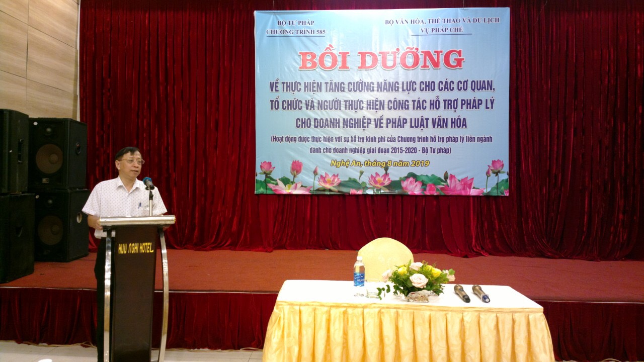 Trên cơ sở hỗ trợ kinh phí của Chương trình 585, ngày 27/8/2019 vừa qua, Vụ pháp chế, Bộ Văn hóa, Thể thao và Du lịch tổ chức Lớp bồi dưỡng về thực hiện tăng cường năng lực cho các cơ quan, tổ chức và người thực hiện công tác hỗ trợ pháp lý cho doanh nghiệp về pháp luật văn hóa tổ chức tại tỉnh Nghệ An.