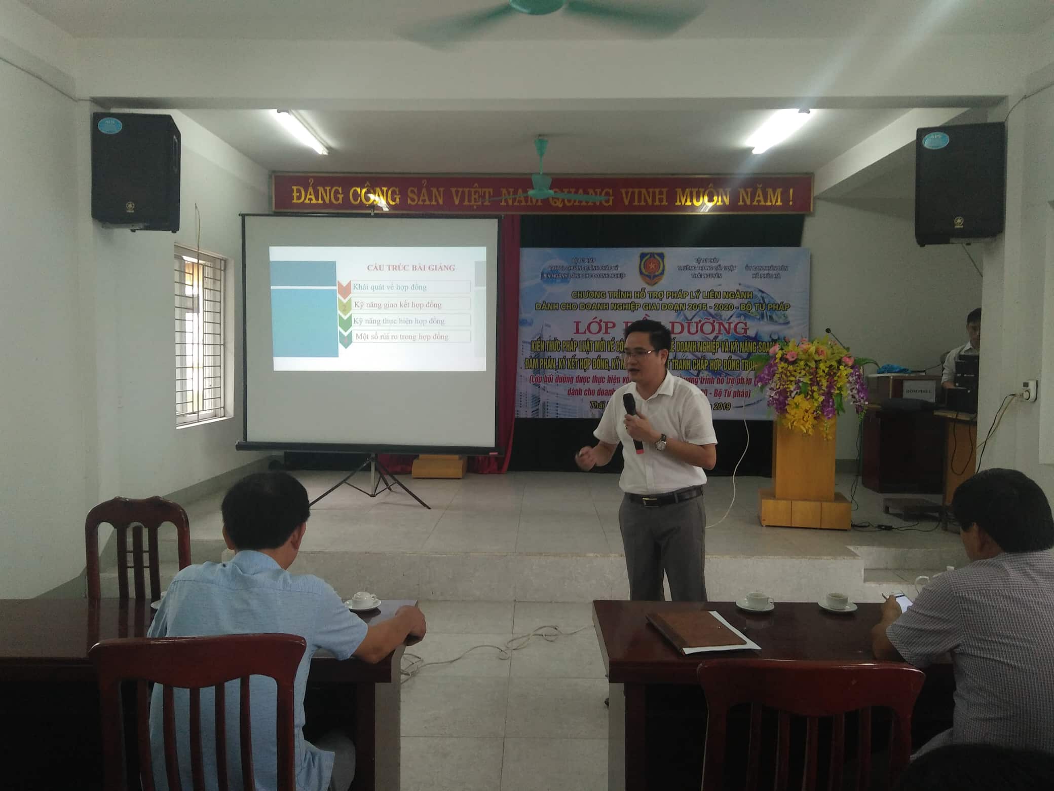 ngày 01/8/2019 vừa qua, Trường Trung cấp Luật Thái Nguyên phối hợp với Ủy ban nhân dân xã Phúc Hà, thành phố Thái Nguyên tổ chức lớp bồi dưỡng “Kiến thức pháp luật mới về công tác pháp chế doanh nghiệp và kỹ năng soạn thảo, đàm phán, ký kết hợp đồng, kỹ năng giải quyết tranh chấp hợp đồng trong kinh doanh” cho 100 học viên là cán bộ pháp chế, cán bộ ở các đơn vị có liên quan được giao làm công tác hỗ trợ pháp lý cho doanh nghiệp thuộc các cơ quan nhà nước; cán bộ thực hiện công tác hỗ trợ pháp lý tại các tổ chức đại diện cho doanh nghiệp, các doanh nghiệp; luật sư, luật gia, cố vấn pháp luật của doanh nghiệp đến từ các doanh nghiệp nhỏ và vừa trên địa bàn tỉnh Thái Nguyên.