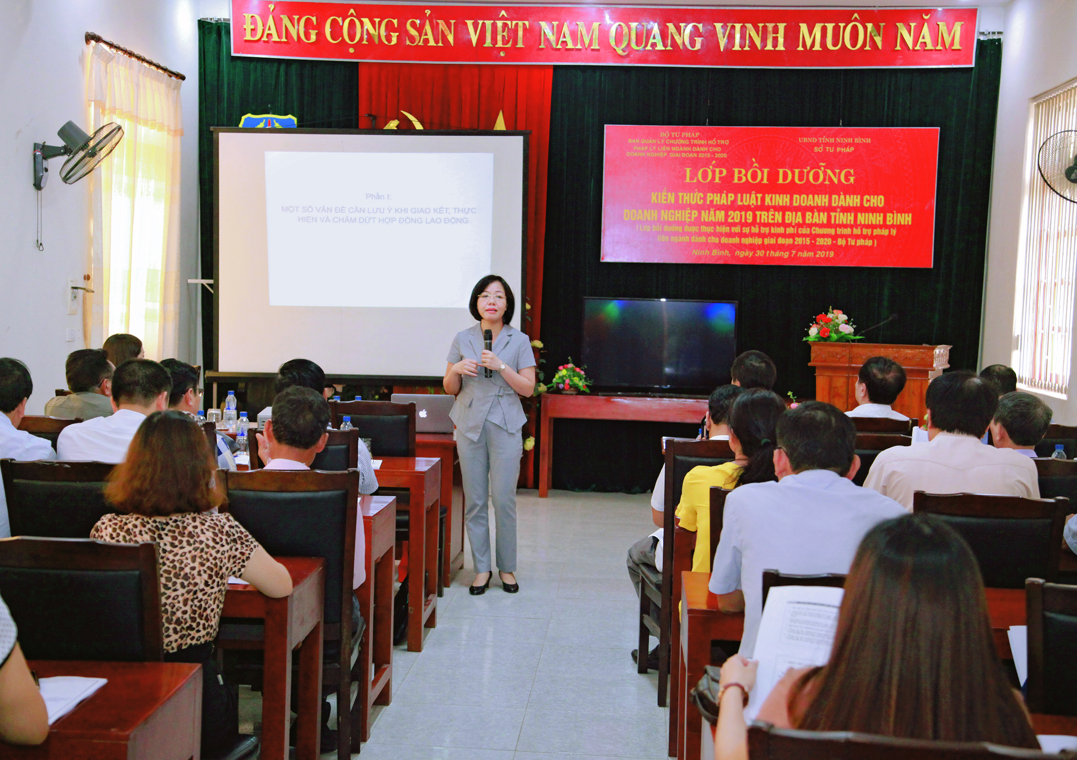 Thực hiện hoạt động do Ban Quản lý chương trình hỗ trợ pháp lý liên ngành dành cho doanh nghiệp giai đoạn 2015 - 2020 (Chương trình 585) giao, trong 02 ngày 30 và 31/7/2019, Sở Tư pháp tỉnh Ninh Bình tổ chức lớp bồi dưỡng kiến thức pháp luật kinh doanh dành cho doanh nghiệp và lớp bồi dưỡng tăng cường năng lực cho các cơ quan, tổ chức, người thực hiện công tác hỗ trợ pháp lý cho doanh nghiệp năm 2019 trên địa bàn tỉnh Ninh Bình.