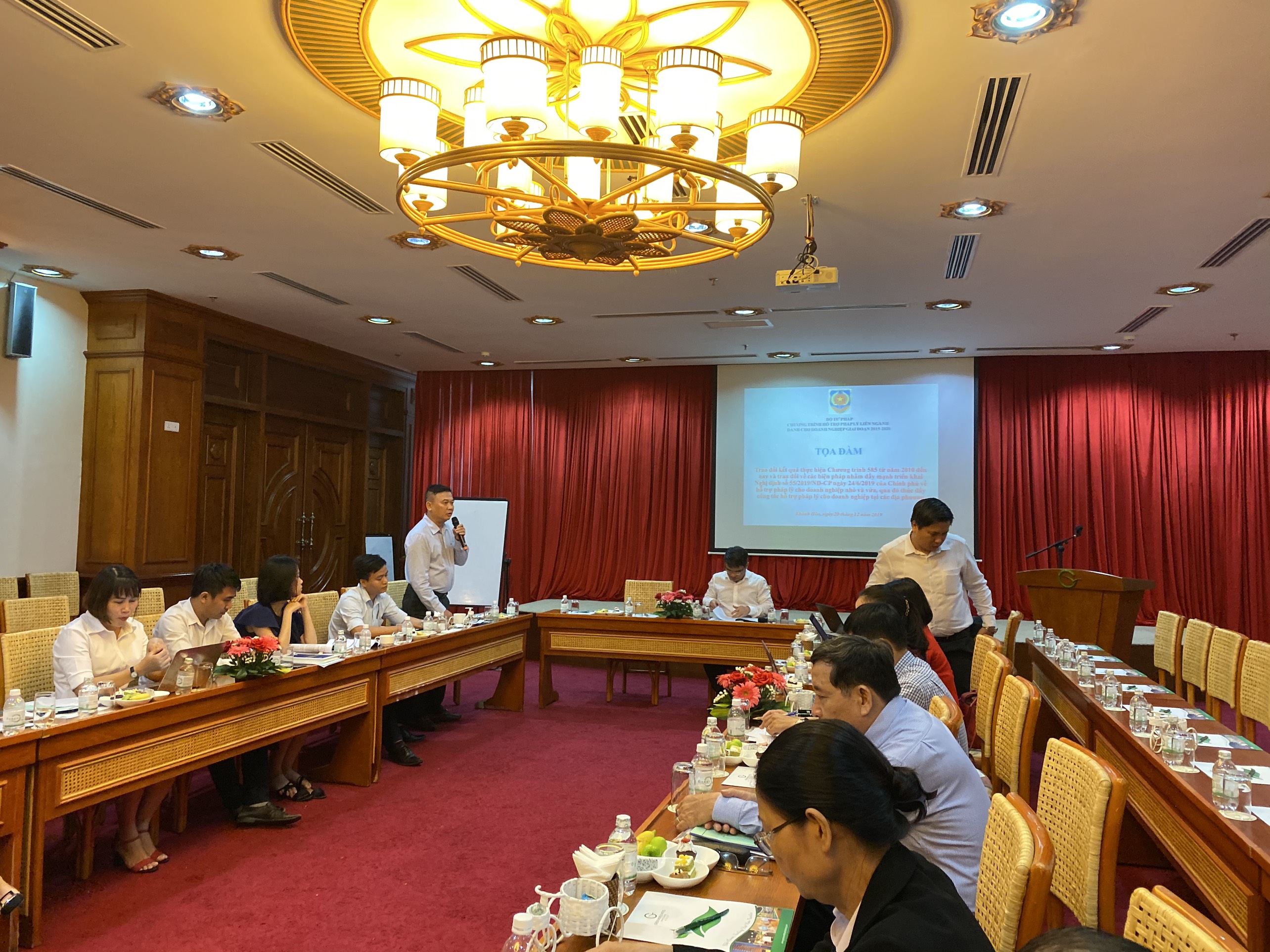 Thực hiện Quyết định số 2195/QĐ-585 ngày 20/8/2019 của Ban Chỉ đạo Chương trình hỗ trợ pháp lý liên ngành dành cho doanh nghiệp (Chương trình 585) về việc ban hành kế hoạch khảo sát đánh giá 10 năm triển khai Chương trình hỗ trợ pháp lý liên ngành dành cho doanh nghiệp và xác định nhu cầu hỗ trợ pháp lý của doanh nghiệp nhỏ và vừa giai đoạn sau năm 2020, Ngày 20/12/2019, Ban Quản lý Chương trình 585 - Bộ Tư pháp tổ chức tọa đàm đánh giá kết quả thực hiện Chương trình hỗ trợ pháp lý liên ngành dành cho doanh nghiệp từ năm 2010 đến nay và định hướng xây dựng Chương trình hỗ trợ pháp lý cho doanh nghiệp giai đoạn sau năm 2020” tại tỉnh Khánh Hòa