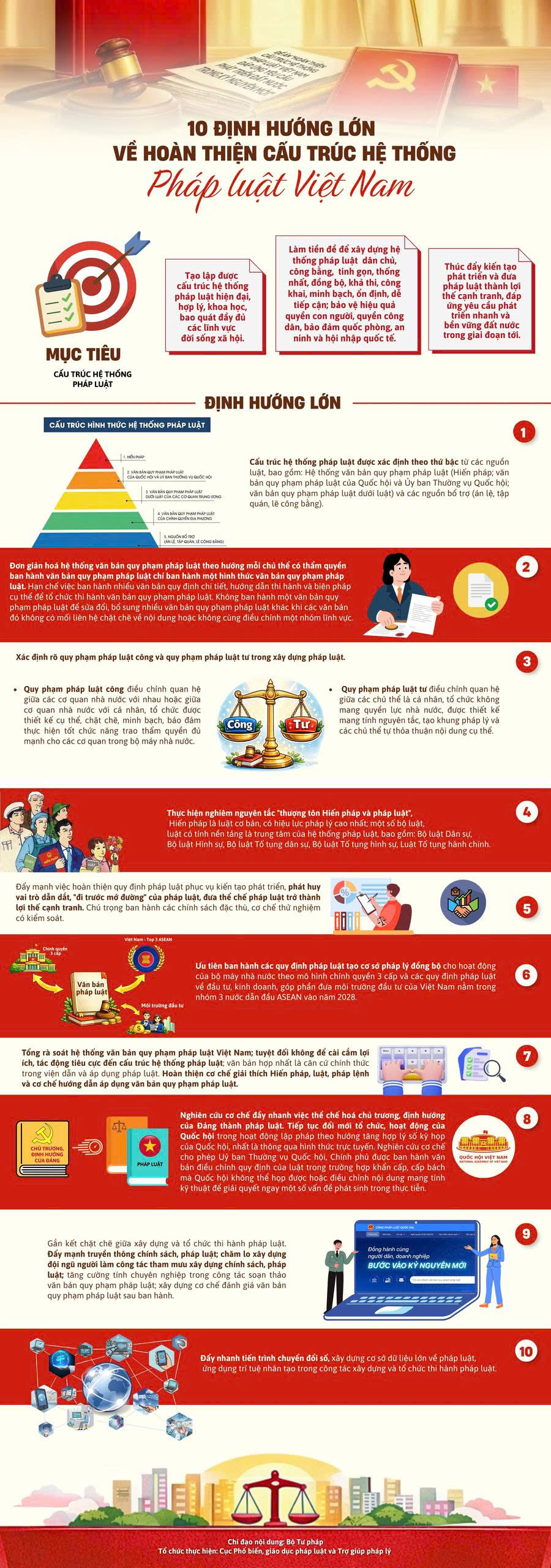 Bộ Tư pháp đã xây dựng Infographic về Kết luận số 09 của Bộ Chính trị về hoàn thiện cấu trúc hệ thống pháp luật Việt Nam. Theo đó, có 10 định hướng lớn về hoàn thiện cấu trúc hệ thống pháp luật Việt Nam. Trân trọng giới thiệu cùng bạn đọc.