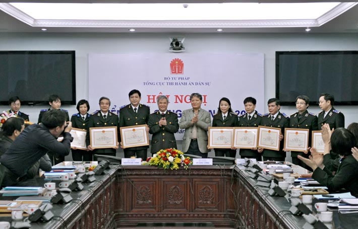 Tại Hội nghị, Lãnh đạo Bộ đã trao tặng 02 Bằng khen của Thủ tướng Chính phủ, 11 Bằng khen của Bộ trưởng Bộ Tư pháp cho các cá nhân và 04 Bằng khen cho Tập thể lao động xuất sắc.