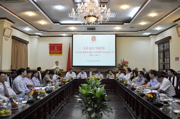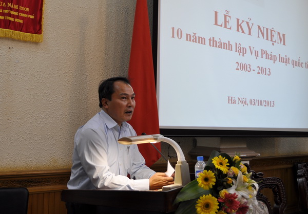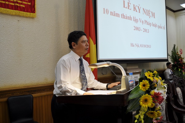 Thay mặt Ban Cán sự, lãnh đạo Bộ Tư pháp, Bộ trưởng Hà Hùng Cường ghi nhận, biểu dương và chúc mừng toàn thể cán bộ, công chức, viên chức đã và đang công tác tại Vụ PLQT nhân dịp kỷ niệm 10 năm ngày thành lập. Bộ trưởng nhấn mạnh: trong 10 năm qua Vụ Pháp luật quốc tế đã không ngừng nỗ lực vươn lên hoàn thành xuất sắc nhiệm vụ chính trị được giao, là chỗ dựa tin cậy của Lãnh đạo Bộ trong công tác tham mưu xây dựng pháp luật và thẩm định dự án, dự thảo điều ước quốc tế, thoả thuận quốc tế và văn bản quy phạm pháp luật liên quan đến pháp luật quốc tế. Bằng ý chí tự lực, tự cường, Vụ đã từng bước trưởng thành về mọi mặt, không ngừng đổi mới và phát triển, thực sự trở thành nhân tố tích cực góp phần vào thành tựu chung của Bộ, Ngành; ngày càng khẳng định được vị trí, vai trò trong sự phát triển kinh tế - xã hội và hội nhập kinh tế - quốc tế của cả nước.