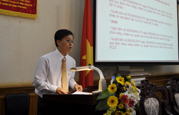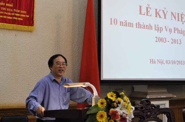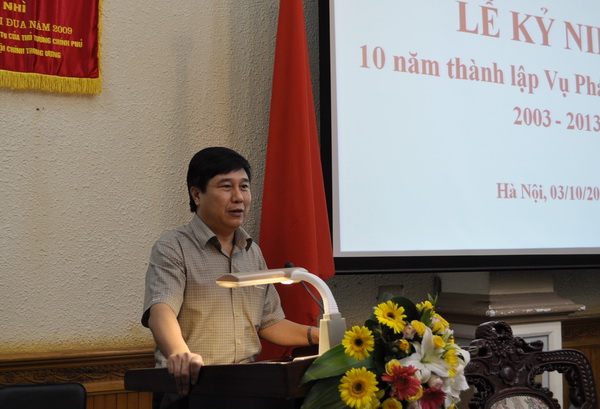 Phát biểu tại buổi lễ, Vụ trưởng Vụ PLQT Nguyễn Khánh Ngọc nhấn mạnh: trong 10 năm qua, cùng với sự lớn mạnh về chức năng, nhiệm vụ, cơ cấu tổ chức và biên chế, Vụ PLQT đã có những đóng góp tích cực, hiệu quả hơn vào việc thực hiện các nhiệm vụ, công tác trọng tâm của Bộ, Ngành Tư pháp cũng như vào quá trình cải cách tư pháp, hoàn thiện hệ thống pháp luật phục vụ hội nhập quốc tế, phát triển kinh tế - xã hội, đã được các đơn vị trong và ngoài Bộ cũng như đối tác nước ngoài đánh giá cao.