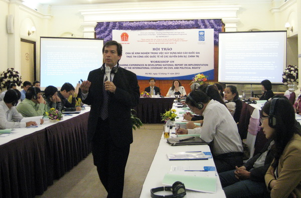 Đối với Việt Nam, Việt Nam đã xây dựng được 02 Báo cáo quốc gia thực thi Công ước ICCPR, báo cáo đầu tiên vào năm 1989 và báo cáo thứ hai là vào năm 2001. Hiện nay, cách thức xây dựng và bảo vệ Báo cáo quốc gia có nhiều điểm mới so với trước đây, cần phải cập nhật để có được cách nhìn nhận một cách tổng thể về việc xây dựng và bảo vệ Báo cáo quốc gia thực thi Công ước ICCPR. Ngoài ra, việc tham khảo kinh nghiệm quốc tế từ các nước khác và từ góc nhìn của Ủy ban Công ước trong việc xây dựng và bảo vệ báo cáo quốc gia thực thi Công ước ICCPR cũng như kinh nghiệm từ việc xây dựng các báo cáo quốc gia thực thi các điều ước quốc tế khác về quyền con người là rất hữu ích. Xuất phát từ yêu cầu và mục đích như vậy, Hội thảo đã được chuyên gia quốc tế đến từ Ủy ban Nhân quyền-là cơ quan trực tiếp hướng dẫn xây dựng và thông qua các báo cáo quốc gia thực thi Công ước ICCPR trình bày về kinh nghiệm xây dựng và bảo vệ báo cáo quốc gia thực thi Công ước này (kinh nghiệm của một số nước và từ góc nhìn của Ủy ban Công ước); các yêu cầu đối với việc xây dựng báo cáo quốc gia; cách thức xây dựng và bảo vệ Báo cáo quốc gia thực thi Công ước ICCPR. Ngoài ra, các chuyên gia Việt Nam đến từ Bộ Ngoại giao và Ủy ban Dân tộc cũng đã chia sẻ kinh nghiệm của Việt Nam trong việc xây dựng Báo cáo ICCPR trước đây cũng như kinh nghiệm trong việc xây dựng và bảo vệ báo cáo quốc gia thực thi các điều ước quốc tế khác về quyền con người…