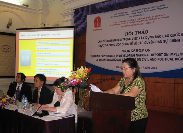 Theo Kế hoạch công tác năm 2013 đã được UNDP và Bộ Tư pháp phê duyệt và được sự đồng ý của Thủ tướng Chính phủ, ngày 12/11/2013, tại Hà Nội, Vụ Pháp luật quốc tế đã tổ chức Hội thảo “Chia sẻ kinh nghiệm trong việc xây dựng Báo cáo quốc gia thực thi Công ước quốc tế về các quyền dân sự, chính trị”. Hội thảo có sự tham dự của chuyên gia quốc tế đến từ Ủy ban Nhân quyền, Luật sư về Luật nhân quyền quốc tế, đại biểu đến từ các cơ quan Trung ương như Bộ Ngoại giao, Bộ Công an, Văn phòng Chính phủ, Ủy ban Dân tộc, Viện kiểm sát nhân dân tối cao...Ngoài ra, Hội thảo còn có sự tham gia của các đại biểu đến từ các cơ quan tư pháp địa phương như Sở Tư pháp các tỉnh: Hà Giang, Tuyên Quang, Sơn La, Phú Thọ, Nghệ An, Bình Định…