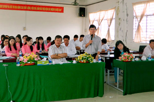 Mở đầu Hội nghị, thầy Dương Thành Đức – Bí thư Chi bộ - Phó Hiệu trưởng Nhà trường đã Báo cáo tóm tắt kết quả công tác năm 2013, phương hướng, giải pháp công tác năm 2014. Tiếp đó, cô Trương Trần Phương Thùy – Phó Chủ tịch Công đoàn cơ sở - Trưởng Khoa Giáo dục, Chính trị, Thể chất và Văn hóa – thành viên Hội đồng Thi đua khen thưởng cơ sở đã Báo cáo công tác thi đua khen thưởng năm 2013, phát động phong trào thi đua khen thưởng năm 2014. Bên cạnh đó, nhằm đánh giá chất lượng tuyển sinh, chất lượng dạy và học năm 2013, phân tích những hạn chế, tìm ra nguyên nhân để có giải pháp cho phù hợp cho năm 2014, cô Trần Thị Mai – Trưởng Khoa Đào tạo cơ bản và cô Nguyễn Quỳnh Anh – Trưởng phòng Đào tạo đã lần lượt tham luận các chuyên đề “Đánh giá chất lượng giảng dạy, chất lượng người học trong năm 2013, giải pháp 2014” và “Đánh giá chất lượng tuyển sinh năm 2013, biện pháp tuyển sinh năm 2014”.