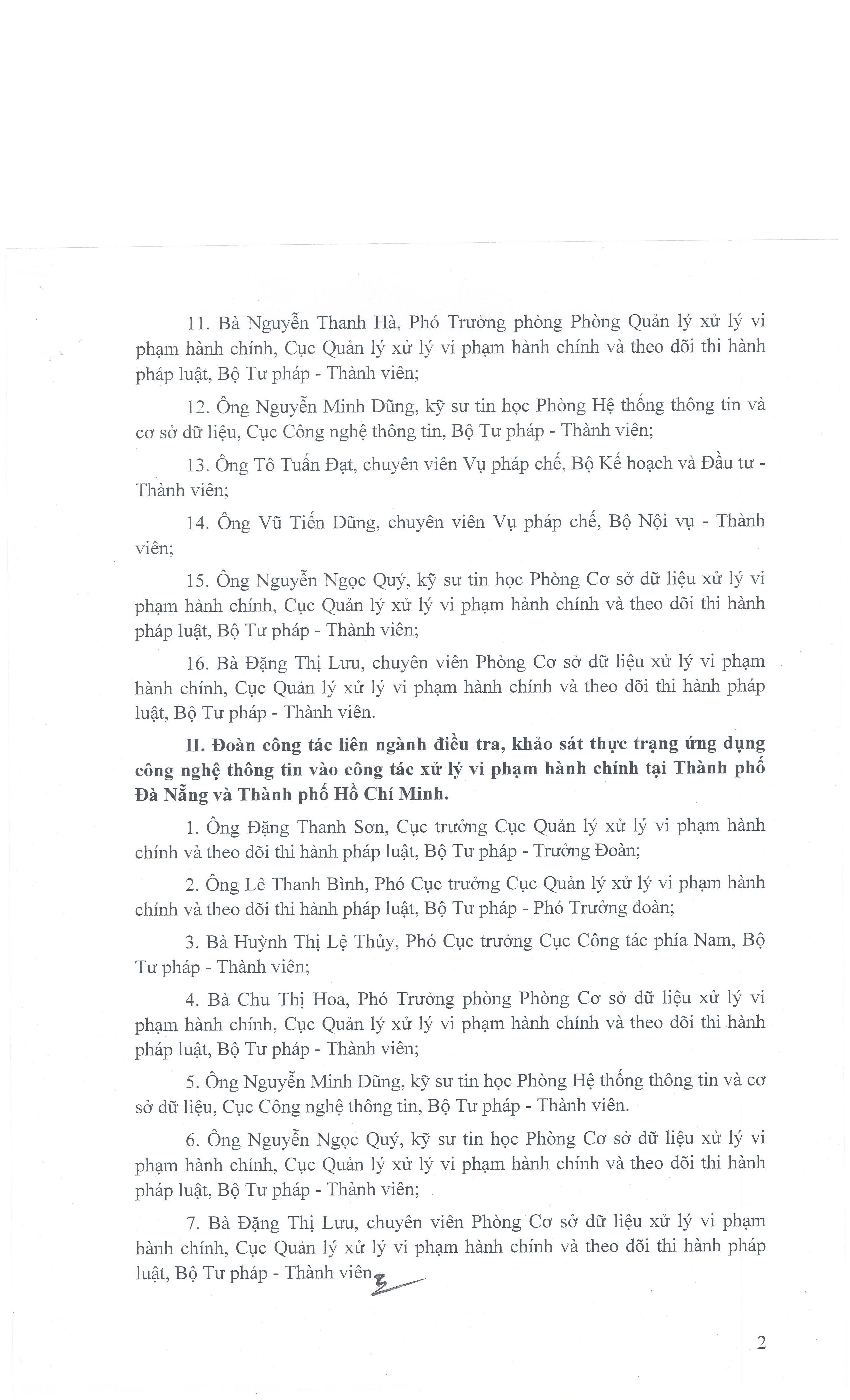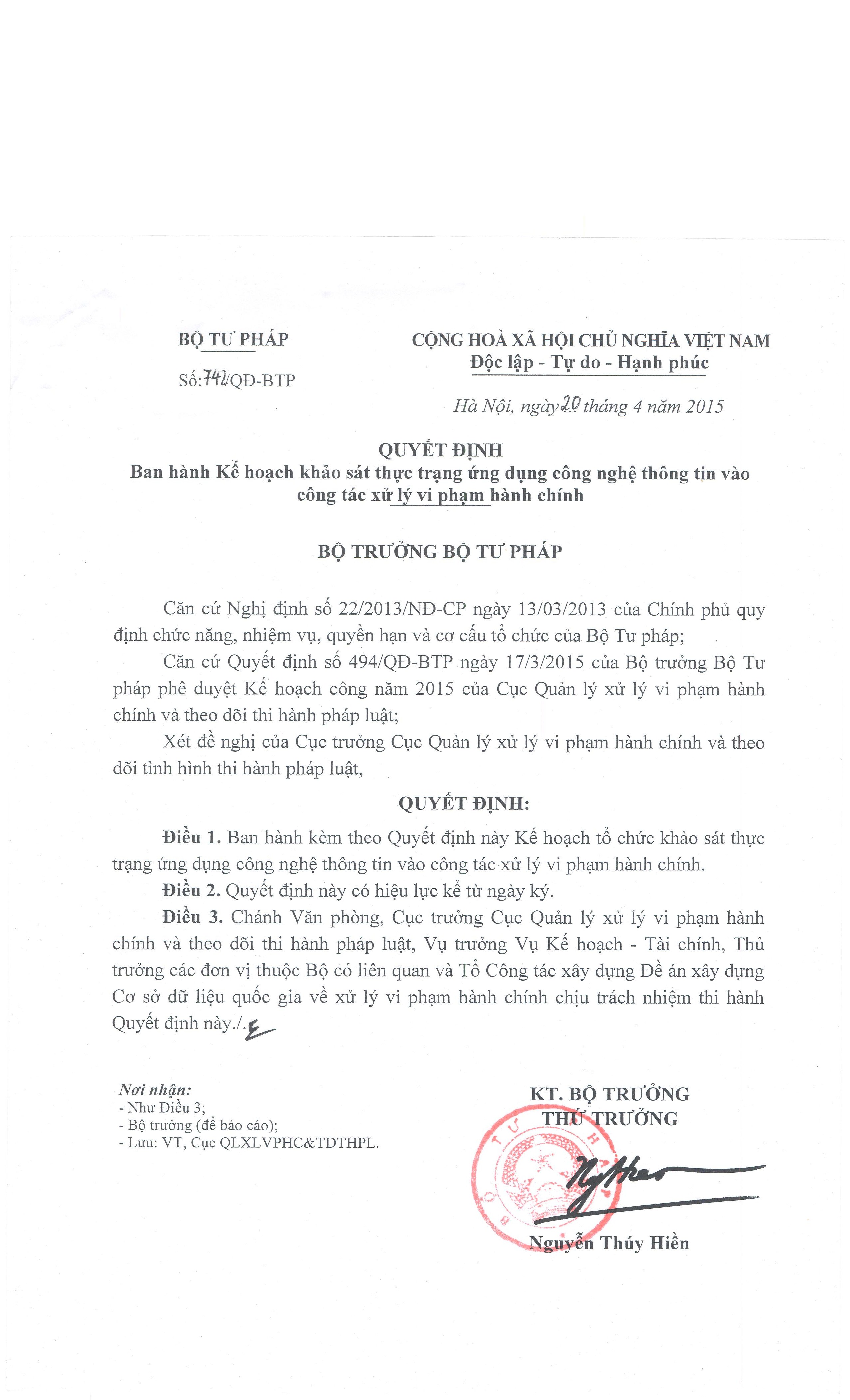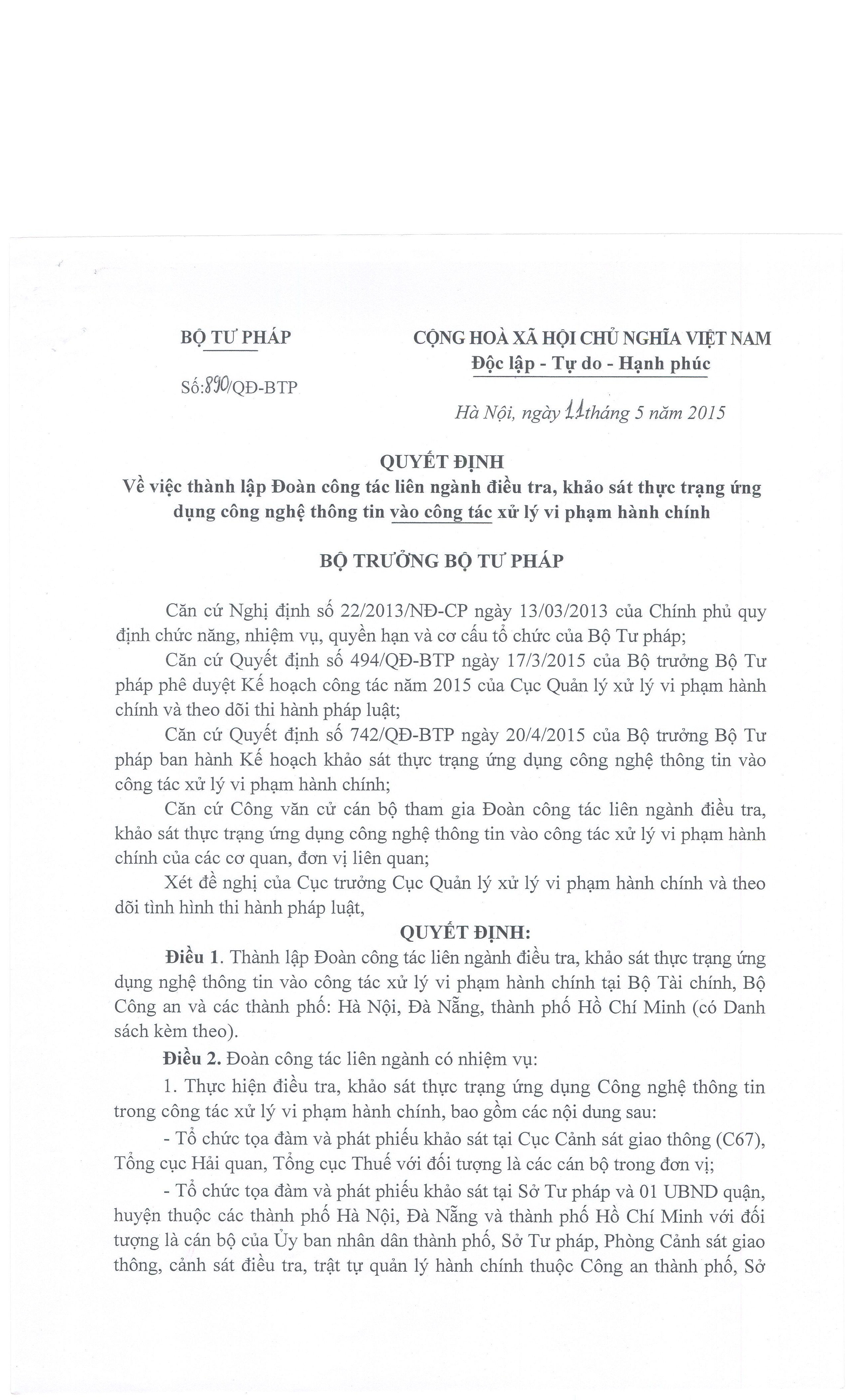 Thực hiện Quyết định số 742/QĐ-BTP ngày 20/4/2015 của Bộ trưởng Bộ Tư pháp về việc ban hành Kế hoạch khảo sát thực trạng ứng dụng công nghệ thông tin vào công tác xử lý vi phạm hành chính, chiều ngày 18/05/2015, Cục Quản lý xử lý vi phạm hành chính và theo dõi thi hành pháp luật (QLXLVPHC&TDTHPL), Bộ Tư pháp đã tổ chức cuộc họp bàn triển khai Kế hoạch khảo sát thực trạng ứng dụng công nghệ thông tin vào công tác xử lý vi phạm hành chính năm 2015 với đại diện các cơ quan, đơn vị hữu quan.