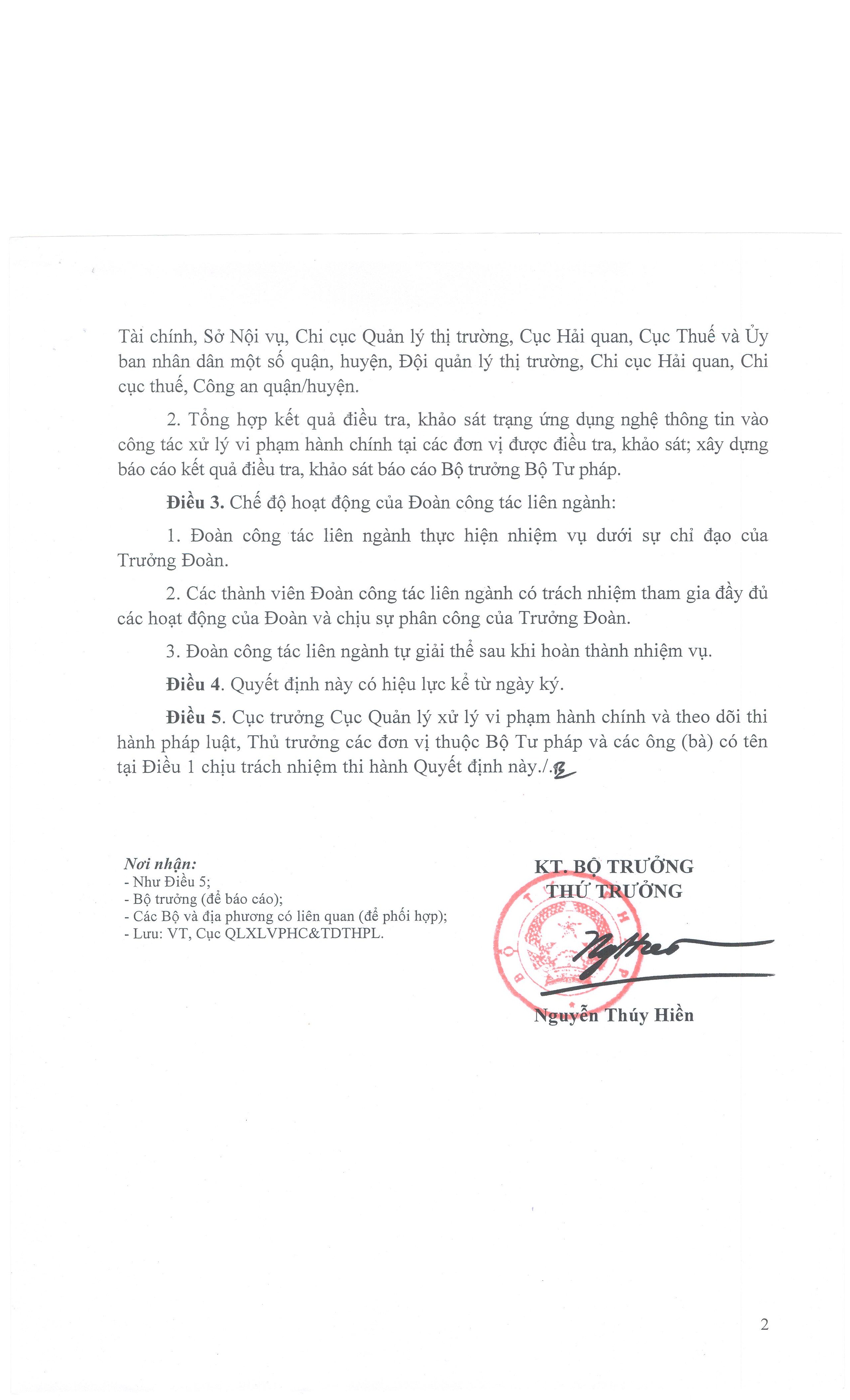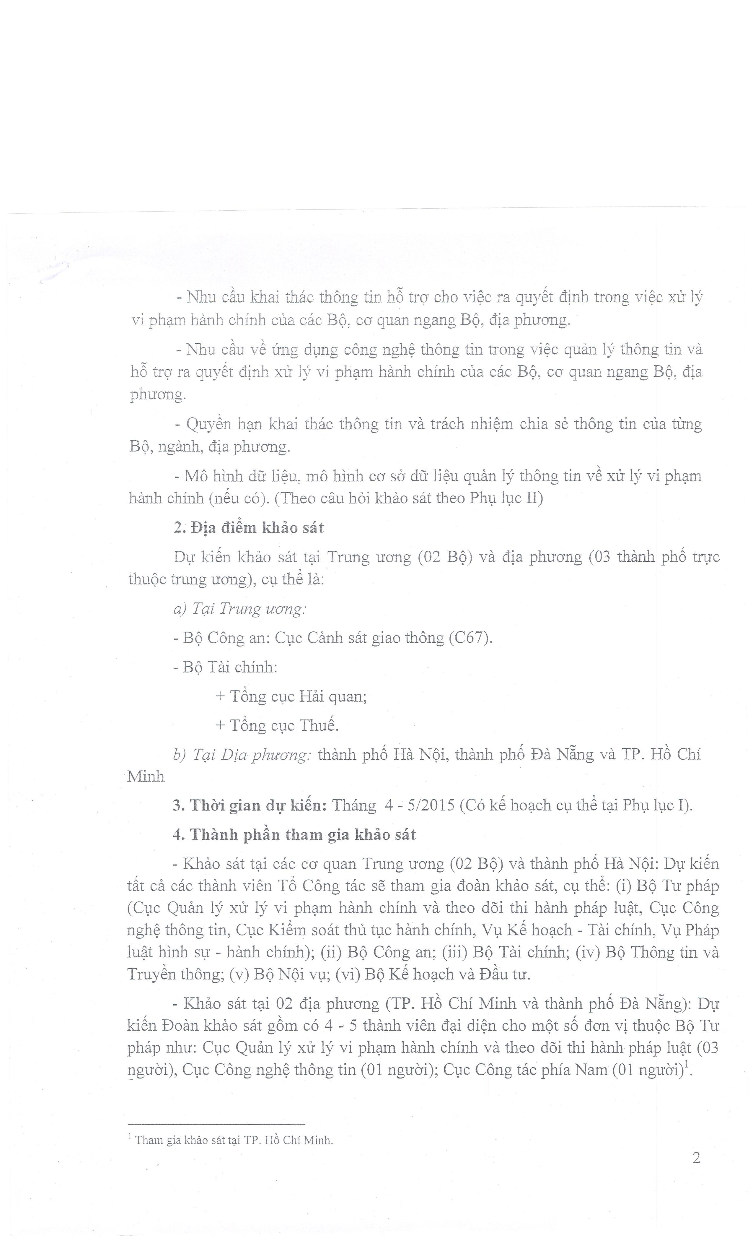 Theo Kế hoạch, Đoàn liên ngành sẽ tiến hành hoạt động khảo sát thực trạng ứng dụng công nghệ thông tin vào công tác xử lý vi phạm hành chính tại một số đơn vị thuộc Bộ Tài chính, Bộ Công an, thành phố Hà Nội, Đà nẵng, Thành phố Hồ Chí Minh trong khoảng  thời gian  từ trung tuần tháng 5 đến hết tháng 6/2015. ./.