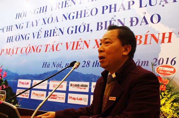Báo PLVN: triển khai Đề án “Chung tay xóa nghèo pháp luật” hướng về biên giới, biển đảo Chào đón thành công Đại hội XII của Đảng và trong không khí mùa xuân đang ngập tràn khắp phố phường, hôm qua (28/1), tại Hà Nội, Báo Pháp luật Việt Nam đã tưng bừng tổ chức Hội nghị triển khai Đề án “Chung tay xóa nghèo pháp luật” hướng về biên giới, biển đảo và gặp mặt cộng tác viên Xuân Bính Thân. Đây là dịp gặp gỡ, tri ân các cộng tác viên, đối tác tích cực của Báo, chia vui với những kết quả công tác tốt đẹp mà Báo đạt được trong năm 2015 và tổ chức thực hiện một sáng kiến mới của Báo.Thứ trưởng Bộ Tư pháp Phan Chí Hiếu, Chuẩn đô đốc Đặng Minh Hải – Phó Chính ủy Quân chủng Hải quân, Đại tá Trần Văn Hậu – Phó Chủ nhiệm Chính trị Cảnh sát biển, Chánh Văn phòng Bộ Tư pháp Trần Tiến Dũng, Phó Chủ tịch UBND tỉnh Quảng Ninh Vũ Thị Thu Thủy đã đến tham dự Hội nghị. Cùng dự có đại diện lãnh đạo các đơn vị thuộc Bộ Tư pháp, đại diện Sở Tư pháp các địa phương, đại diện lãnh đạo một số đơn vị thuộc Bộ Nông nghiệp và Phát triển nông thôn, Bộ Tư lệnh Bộ đội Biên phòng, các đối tác và đông đảo cộng tác viên của Báo Pháp luật Việt Nam (PLVN).Về phía Báo PLVN, có TS.Đào Văn Hội – Tổng Biên tập, các Phó Tổng biên tập và toàn thể cán bộ, phóng viên của Báo.Khẳng định được vị thế, vai trò và uy tín chính trị của BáoTrình bày một số kết quả cơ bản năm 2015 của Báo, Phó Tổng biên tập thường trực Đặng Ngọc Luyến cho biết, năm qua Báo tiến hành xuất bản 8 ấn phẩm báo in và 2 trang báo điện tử, đều đúng định hướng thông tin, đúng tôn chỉ, mục đích và các chức năng, nhiệm vụ được giao để khẳng định vị thế, vai trò và uy tín chính trị của Báo trong hệ thống truyền thông và báo chí cách mạng. Ấn phẩm báo ngày đã bám sát các vấn đề thời sự chính trị, pháp luật trong nước; nhiệm vụ trọng tâm, trọng điểm của Bộ, ngành Tư pháp trong năm. Các số phụ thì thực hiện tốt mục tiêu đa dạng hóa các kênh thông tin, tuyên truyền pháp luật đến với người dân, góp phần đưa Báo PLVN trở thành tờ báo có số lượng ấn phẩm đa dạng và có nhiều bạn đọc trên khắp mọi miền đất nước. Không chỉ thực hiện tốt nghiệp vụ làm báo, năm 2015, Báo PLVN còn ghi dấu ấn đậm nét trong các hoạt động truyền thông pháp luật khác thông qua việc tổ chức các hoạt động xã hội từ thiện và tổ chức sự kiện thể hiện vai trò và trách nhiệm xã hội đối với bạn đọc trong cả nước. Các sự kiện xã hội từ thiện được Báo tổ chức hàng năm, trở thành một hoạt động định kỳ của Báo với các hoạt động tiêu biểu là Chương trình “Chung tay xóa nghèo pháp luật” đưa báo PLVN về với vùng sâu, vùng xa; Chương trình vinh danh Gương sáng Tư pháp, Cuộc thi tìm hiểu về ngành Tư pháp. Ngoài ra, Báo vẫn đảm bảo cân đối tài chính, ổn định đời sống và thu nhập của người lao động.Với những nỗ lực to lớn trong công tác, năm 2015, Báo PLVN đã vinh dự được Chủ tịch nước tặng thưởng Huân chương Lao động hạng Nhất, nhiều cá nhân được nhận danh hiệu thi đua cao quý của Đảng, Chính phủ. Và phần thưởng to lớn nhất mà Báo PLVN nhận được chính là sự tin tưởng của Lãnh đạo Đảng, Nhà nước, Bộ Tư pháp; sự hợp tác, giúp đỡ của các doanh nghiệp đối tác của Báo và đặc biệt là sự yêu mến của hàng triệu bạn đọc trong cả nước đã đồng hành cùng Báo. Vì vậy, Phó Tổng biên tập Đặng Ngọc Luyến trân trọng gửi lời cảm ơn chân thành đến Lãnh đạo Bộ Tư pháp, các cộng tác viên, các doanh nghiệp đối tác và bạn đọc đã dành tình cảm yêu mến, hợp tác, giúp đỡ Báo trong năm qua.Trong buổi lễ, Báo PLVN đã gửi lời tri ân đến các cộng tác viên có những đóng góp cho sự phát triển của Báo năm 2015. Tổng Biên tập Đào Văn Hội đã gửi tặng những bó hoa tươi thắm thay cho lời cảm ơn của Báo PLVN đến các cộng tác viên tiêu biểu của Báo.Tích cực trong định hướng dư luận xã hội, ý thức của bạn đọcBiểu dương truyền thống tốt đẹp của Báo PLVN mỗi dịp Tết đến Xuân về, Thứ trưởng Phan Chí Hiếu vui mừng nhận thấy năm 2015 và những năm qua, các mặt hoạt động của Báo PLVN tiếp tục đổi mới mạnh mẽ; đội ngũ cán bộ, viên chức, người lao động, phóng viên, cộng tác viên không ngừng trưởng thành, lớn mạnh cả về số lượng, bản lĩnh chính trị và trình độ chuyên môn, nghiệp vụ. Theo Thứ trưởng, một trong những điểm nhấn đánh dấu sự thành công của Báo những năm qua là sự đóng góp tích cực trong việc thông tin, tuyên truyền phục vụ công cuộc đổi mới toàn diện đất nước, hình thành và phát triển kinh tế thị trường gắn với xây dựng Nhà nước pháp quyền XHCN Việt Nam, bảo vệ quyền con người, quyền công dân.Trong bối cảnh hội nhập kinh tế sâu rộng, Thứ trưởng đề ng