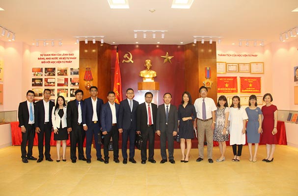 TS. Nguyễn Xuân Thu - Phó giám đốc Học viện Tư pháp cùng các cán bộ Học viện Tư pháp đã đón tiếp và làm việc với đoàn. Thay mặt lãnh đạo Học viện Tư pháp, TS. Nguyễn Xuân Thu giới thiệu với đoàn công tác về chức năng, nhiệm vụ, tổ chức của Học viện và một số nét chính trong quá trình phát triển, phương hướng phát triển, hoạt động đào tạo tại Học viện Tư pháp.