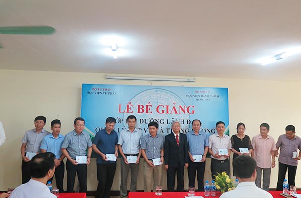 Sau hai tháng học tập liên tục, cuối tuần qua, Học viện Tư pháp phối hợp với Vụ Tổ chức cán bộ, Bộ Tư pháp và Học viện Hành chính Quốc gia tổ chức Bế giảng Lớp Bồi dưỡng lãnh đạo, quản lý cấp Vụ và tương đương. Ông Nguyễn Quang Thái, Vụ trưởng Vụ Tổ chức cán bộ, Bộ Tư pháp, Nhà giáo ưu tú Vũ Thanh Xuân, Phó Giám đốc Học viện Hành chính Quốc gia tham dự buổi bế giảng.