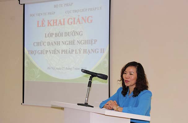 Phát biểu tại Lễ khai giảng, bà Nguyễn Thị Minh - Cục trưởng Cục trợ giúp pháp lý Bộ Tư pháp khẳng định việc tham gia lớp học này là hết sức quan trọng để các học viên trang bị kiến thức, kỹ năng cần thiết của trợ giúp viên pháp lý. Đồng chí yêu cầu các học viên giữ vững kỷ luật trong thời gian học tập, chủ động trao đổi, thảo luận, học hỏi để hoàn thành xuất sắc khóa học.
