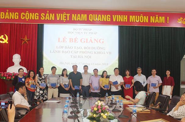 Ngày 14/11 vừa qua, Giám đốc Học viện Tư pháp đã ký quyết định công nhận hoàn thành chương trình và cấp chứng chỉ hoàn thành chương trình đào tạo, bồi dưỡng lãnh đạo cấp phòng khóa VII năm 2018 cho 142 học viên (đạt tỷ lệ 93,42%). Tiếp đó, Giám đốc Học viện cũng ký quyết định khen thưởng 8 học viên lớp khóa VII đã có thành tích trong phong trào xây dựng trường lớp và có thành tích trong học tập.