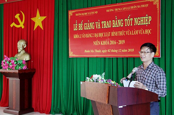Phát biểu Lễ, TS. Nguyễn Triều Dương chúc mừng 51 tân cử nhân luật, đồng thời đánh giá cao những kết quả trong học tập và rèn luyện của lớp, đặc biệt biểu dương tập thể lớp luôn đoàn kết để hoàn thành xuất sắc khoá học, cụ thể: có 03 học viên đạt loại giỏi, 38 học viên đạt loại khá, 10 học viên đạt loại trung bình khá, đây là thành tích rất cao so với các khoá trước. TS. Nguyễn Triều Dương hy vọng rằng, từ những kiến thức, kỹ năng mà các học viên đã được lĩnh hội từ quý thầy cô của Trường Đại học Luật Hà Nội, các em sẽ tự tin và khẳng định năng lực của mình nơi đang công tác. TS. Nguyễn Triều Dương cũng gửi lời cảm ơn tới Ban Giám hiệu và tập thể quý thầy cô Trường Trung cấp Luật Buôn Ma Thuột đã tạo mọi điều kiện và phối hợp quản lý lớp học thành công như ngày hôm nay, mặt khác mong muốn tiếp tục phối hợp để mở lớp tiếp theo (lớp văn bằng 2, khoá 4), dự kiến sẽ khai giảng vào giữa tháng 12 năm 2018.
