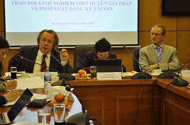 Chia sẻ thông tin về hệ thống cơ quan đăng ký tài sản và thực tiễn triển khai đăng ký tài sản tại Pháp, Giáo sư Michel Grimaldi cho biết, ở Pháp chỉ thực hiện đăng ký tài sản bảo đảm là bất động sản và động sản là tài sản được hai bên giao kết hợp đồng sử dụng làm thế chấp, tín chấp chứ không thực hiện đăng ký cho các loại tài sản khác. Theo Giáo sư, đăng ký bất động sản có tác dụng tích cực nhưng cũng có sự cản trở. Về tác dụng, việc đăng ký mang đến sự đảm bảo về mặt pháp lý cho người sở hữu. Tuy nhiên, nó mang đến sự cản trở như, trường hợp cá nhân không muốn tiết lộ thông tin về tài sản, nên cuối thế kỷ 19, đầu thế kỷ 20, có luồng ý kiến cho rằng, không công khai vì nó làm lộ thông tin về tài sản cũng như tình trạng nợ nần của cá nhân. Mặc dù hiện nay ở Pháp không còn ý kiến này nhưng trên thực tế nó vẫn tồn tại. Giáo sư cũng chia sẻ thêm, ở Pháp, có hai hình thức đăng ký là đăng ký theo tên người và đăng ký theo địa bạ (là đăng ký theo chính mảnh đất đó). Đăng ký theo tên người có nhược điểm, nên nó được thay thế bằng hình thức đăng ký theo chính chính mảnh đất đó. Và việc đăng ký theo địa bạ được thực hiện rất tốt ở Pháp.