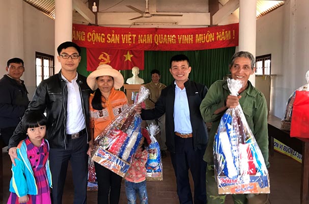 Đồng chí Trần Danh Phú - Bí thư Chi bộ, Phó Hiệu trưởng Nhà trường và đồng chí Tô Viết Vinh - Chủ tịch Công đoàn Nhà trường trao quà cho các hộ nghèo và gia đình chính sách