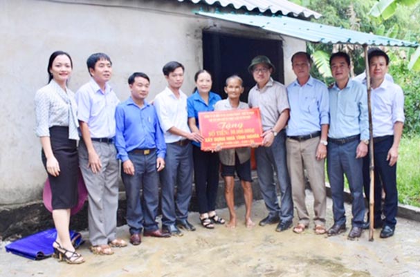 Tiếp theo Chương trình, trong cơn mưa chiều, Đoàn công tác cùng với đại diện Lãnh đạo Sở Tư pháp tỉnh Hà Tĩnh, Huyện ủy, Hội đồng nhân dân, Ủy ban nhân dân huyện Can Lôc, Công ty Cổ phần Đầu tư và Xây dựng Bàn Thạch đã trực tiếp trao số tiền 50 triệu đồng từ nguồn kinh phí xã hội hóa để xây dựng Nhà tình nghĩa cho bà Từ Thị Hợp ở thôn Văn Cử, xã Xuân Lộc, huyện Can Lộc, tỉnh Hà Tĩnh. Bà Từ Thị Hợp năm nay đã 70 tuổi, là đối tượng có hoàn cảnh đặc biệt khó khăn. Hiện bà đang sống trong căn nhà cấp 4 nhỏ bé, lợp ngói fibro xi măng, đồ đạc trong nhà không có gì ngoài chiếc giường ngủ, xung quanh là các bao tải thóc. Hy vọng số tiền hỗ trợ cùng với sự quan tâm, góp sức của chính quyền, nhân dân địa phương, bà Từ Thị Hợp sẽ có một căn nhà khang trang, tiện nghi, vững chắc hơn để che trở cho bà trong những ngày hè nắng gắt, những ngày đông giá lạnh và những cơn bão luôn trực ập đến vùng đất có điều kiện tự nhiên khắc nghiệt này.